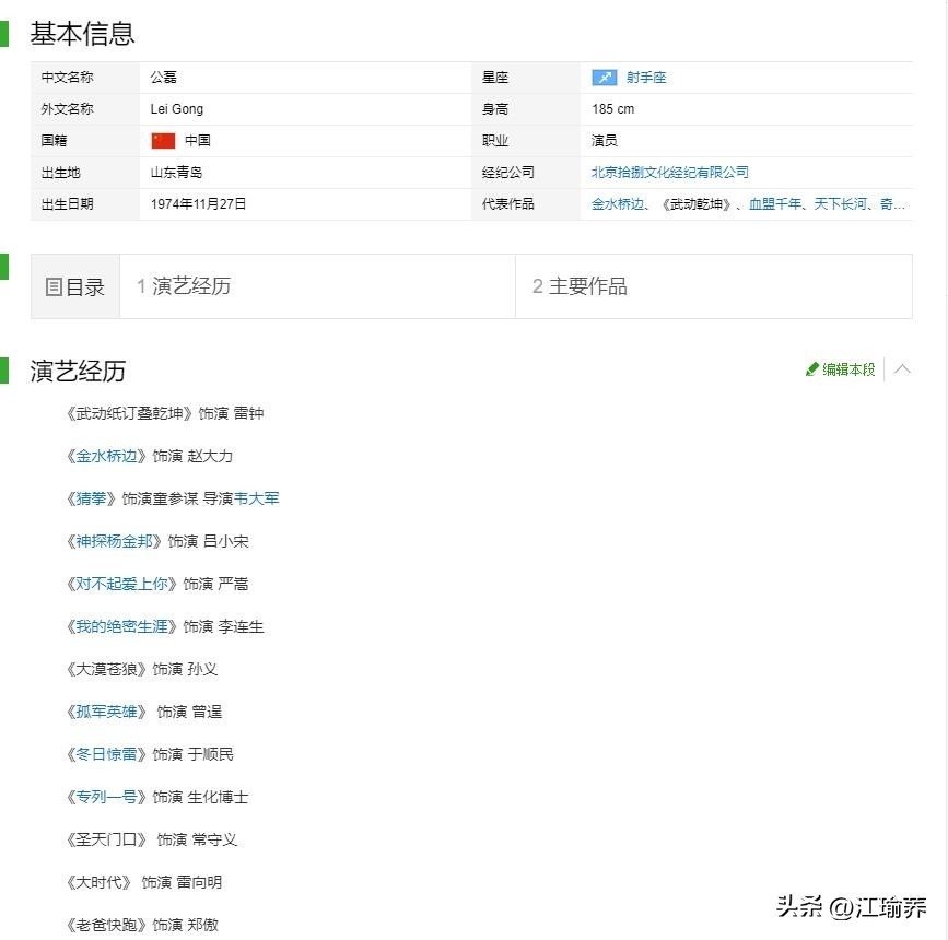 很多明星都有百度百科,大家的介绍都会包括成长经历、作品介绍、绯闻对象、家庭生活,等内容。而公磊的百度百科里的,只有介绍其参演的作品,除此之外,再无其它。