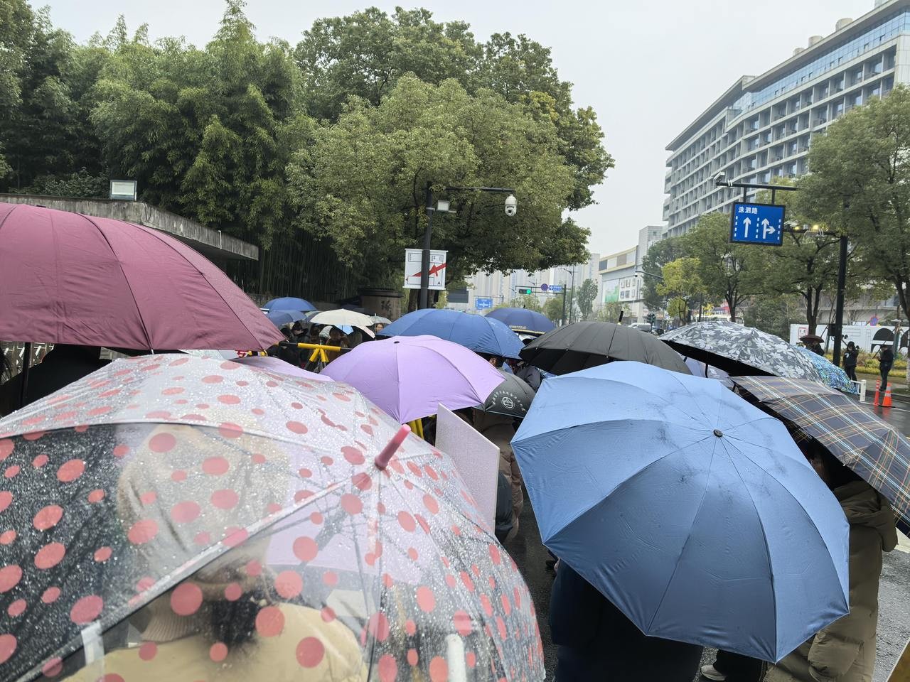 国美校考考场外,每把伞下都是一个送考的家长。 记者邱伊娜摄