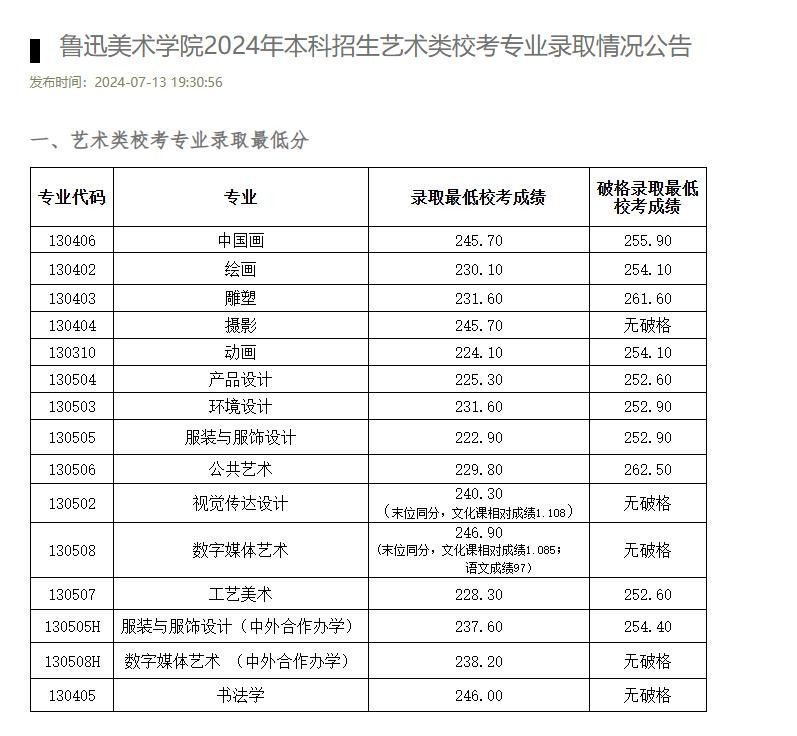 2024年鲁迅美术学院本科招生艺术类校考专业录取情况公告