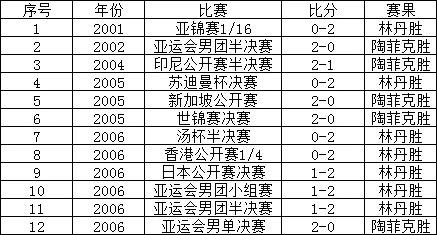 两个月后的亚锦赛上,陶菲克也遭遇了他命中的对手,初出茅庐的林丹,年轻的林丹虽然技术粗糙,却用恐怖的体力和超强的身体素质压制了陶菲克。2-0,林丹取得了首次林陶对决的胜利。