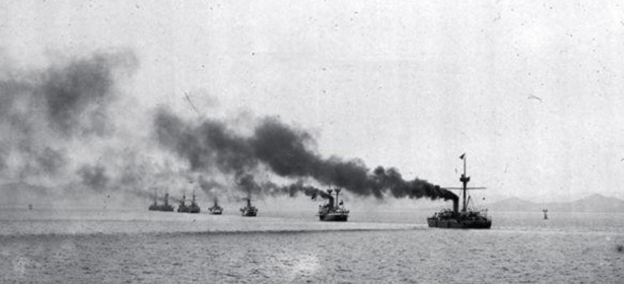 照片中的北洋海军编队驶离大连湾,排列为纵队的军舰由近及远依次是:“济远”舰、“致远”舰、“超勇”“扬威”舰、“经远”“来远”舰、“镇远”和“定远”舰