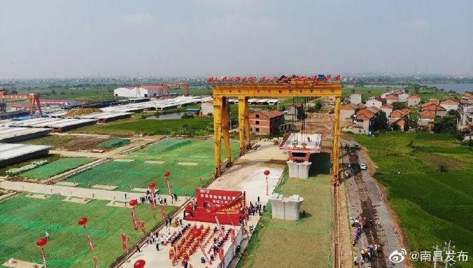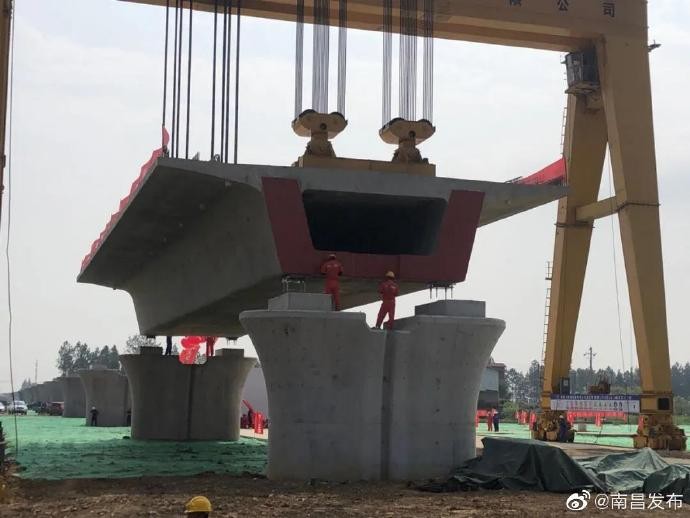 8月28日上午10时,一片长32.6米、高3.1米、重790吨的预制箱梁成功架设到昌景黄高铁金溪湖特大桥363号、364号桥墩上,这是大桥架设的第一片箱梁,标志着昌景黄高铁架梁作业正式拉开序幕。