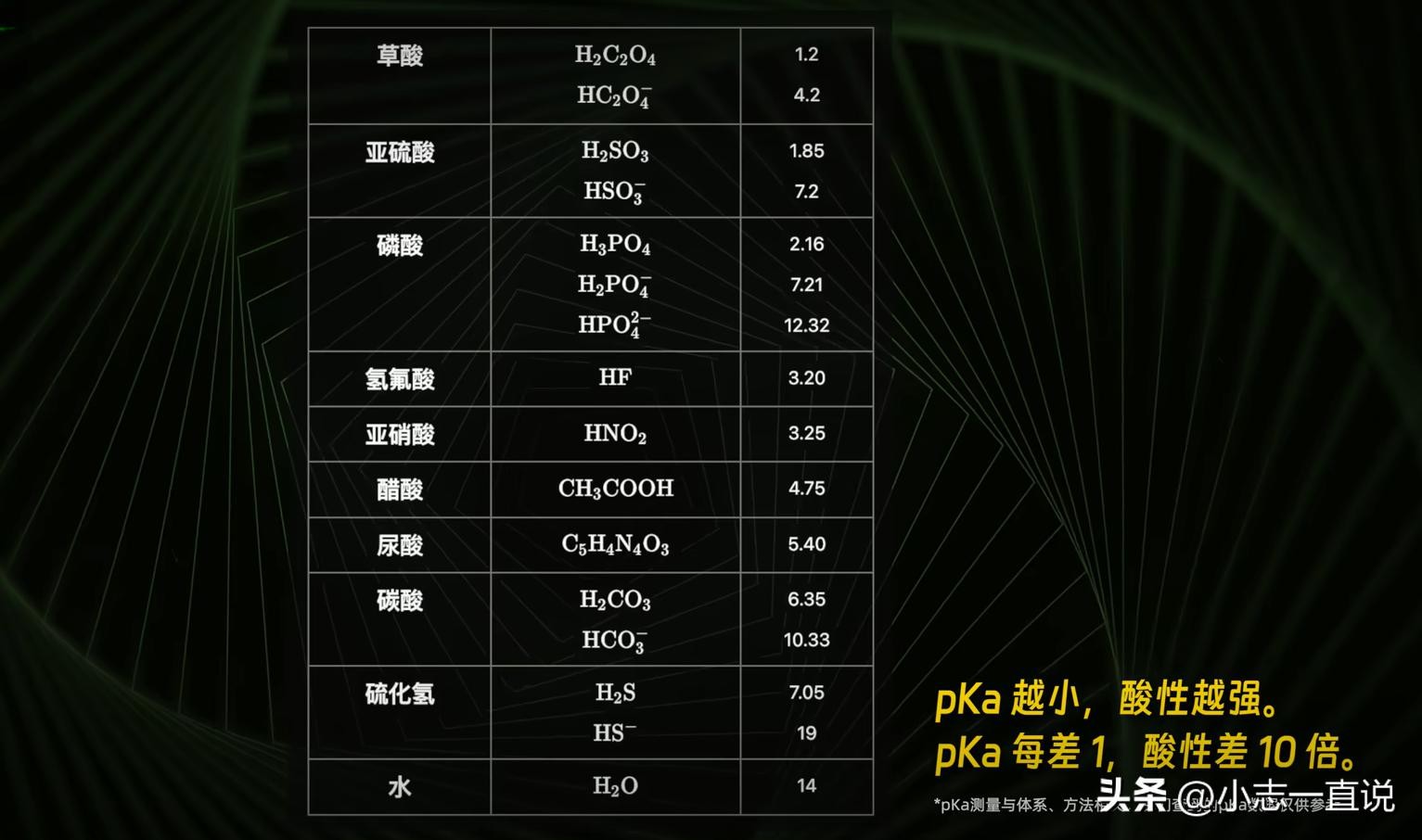 后来化学家提出pKa概念,它是酸解离方程平衡常数的负对数,可衡量酸解离氢离子的绝对能力,更客观地比较酸的强弱。pKa值越小酸性越强,且每相差1,酸性相差10倍。