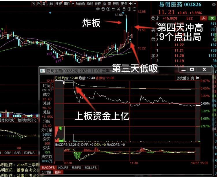 第二种类型:打板炸板+竞价大幅低开慢慢洗盘回升不出水(被套10个点左右),应对策略1、这种类型炸板大幅度低开,然后回升属于大多数的正常预期,而且普遍性很大,有价值。2、这种类型的应对策略是,不要在竞价出局,等待开盘后第一波或者第二波冲高出局,一般就是亏10%左右,当天建议先割肉出局,到第二天(即炸板后第三天)开盘(-5)低吸或者尾盘(-5)低吸进去,炸板后第四天冲高不涨停出局。(案例:易明医药,还有其他大量案例,大家自己去复盘对证)3、简单记忆:打板炸板(第1天)+(第2天)竞价大幅低开慢慢洗盘回升不出水(被套10个点左右)+(第3天)-5左右尾盘低吸=(第4天)冲高不涨停出局。